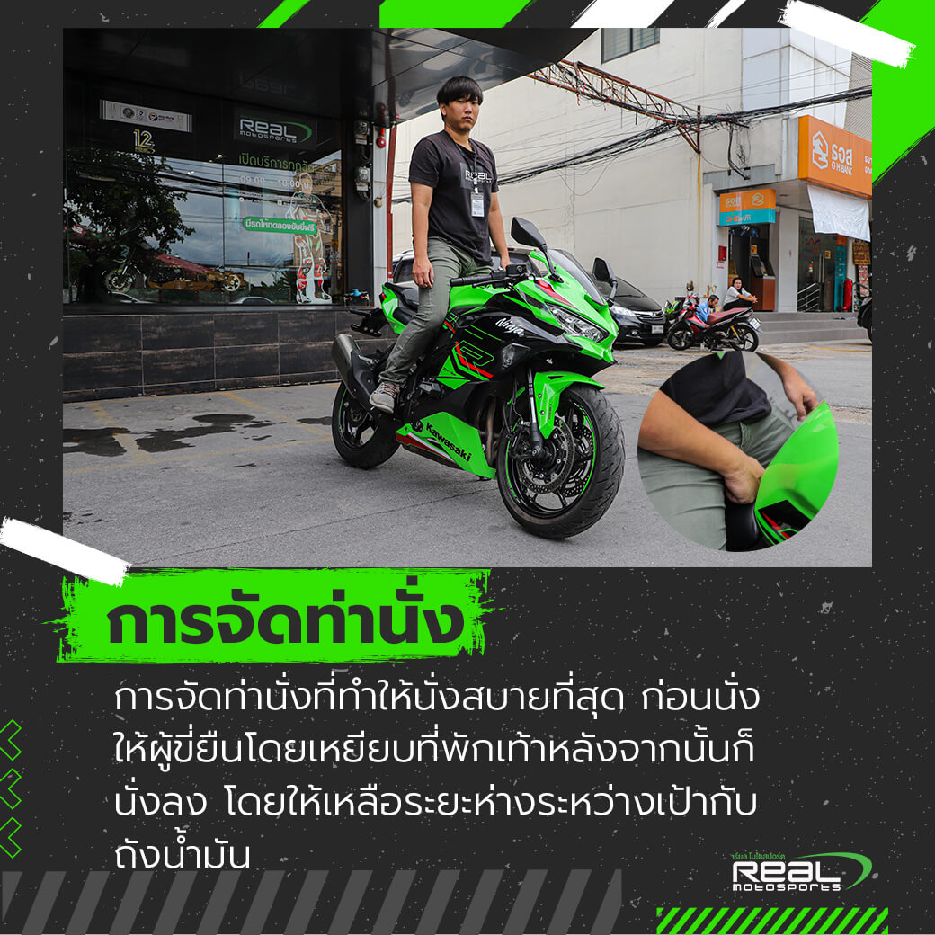 สะโพกจะเป็นหนึ่งในส่วนที่จะใช้ในการเข้าโค้ง เมื่อเราเลี้ยวซ้ายสะโพกจะเขยิบมาด้านซ้าย เพื่อถ่ายน้ำหนักลงไปด้านซ้าย ดังนั้นเราควรเว้นระยะห่างจากถังน้ำมัน 1 กำปั้น เพื่อให้เราสามารถเอี้ยวตัวเวลาเข้าโค้งได้ครับสำหรับการจัดท่า เมื่อเราขึ้นไปนั่งที่รถแล้วให้เรายืนขึ้นโดยเท้าเหยียบตรงพักเท้า หลังจากนั้นก็นั่งลงซึ่งนั้นจะเป็นตำแหน่งที่เหมาะสมที่สุดและนั่งได้สบายที่สุดครับ