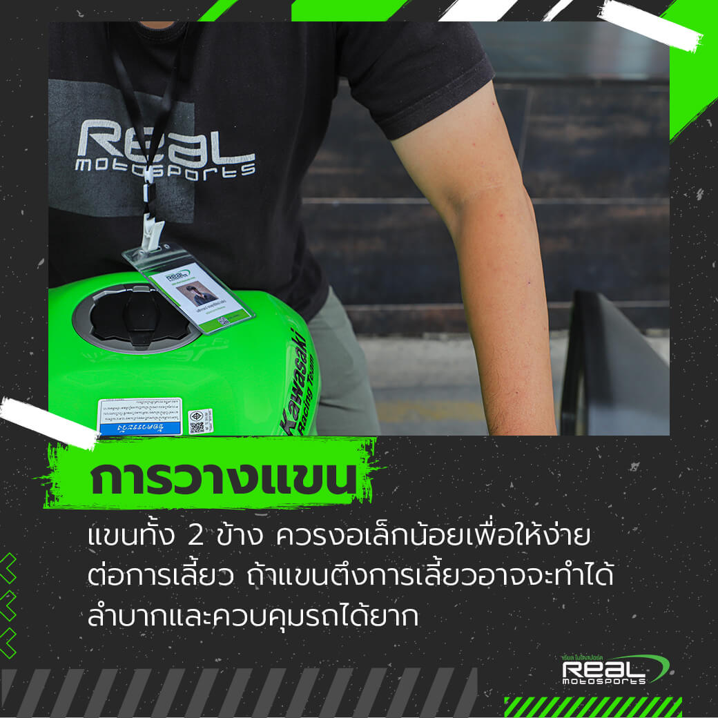 ต่อเนื่องจากจุดที่ 4 เมื่อหลังและไหล่อยู่ในตำแหน่งที่ถูกต้อง แขนไม่ควรตึงเพราะอาจจะทำให้เราเลี้ยวรถไม่ได้ครับ การวางแขนที่ดี ข้อศอกจะงอเล็กน้อยและโน้มมาด้านหน้าเล็กน้อยเพื่อให้เวลาเราเลี้ยวแขนจะได้ไม่ติดครับโดยเฉพาะการเข้าโค้ง