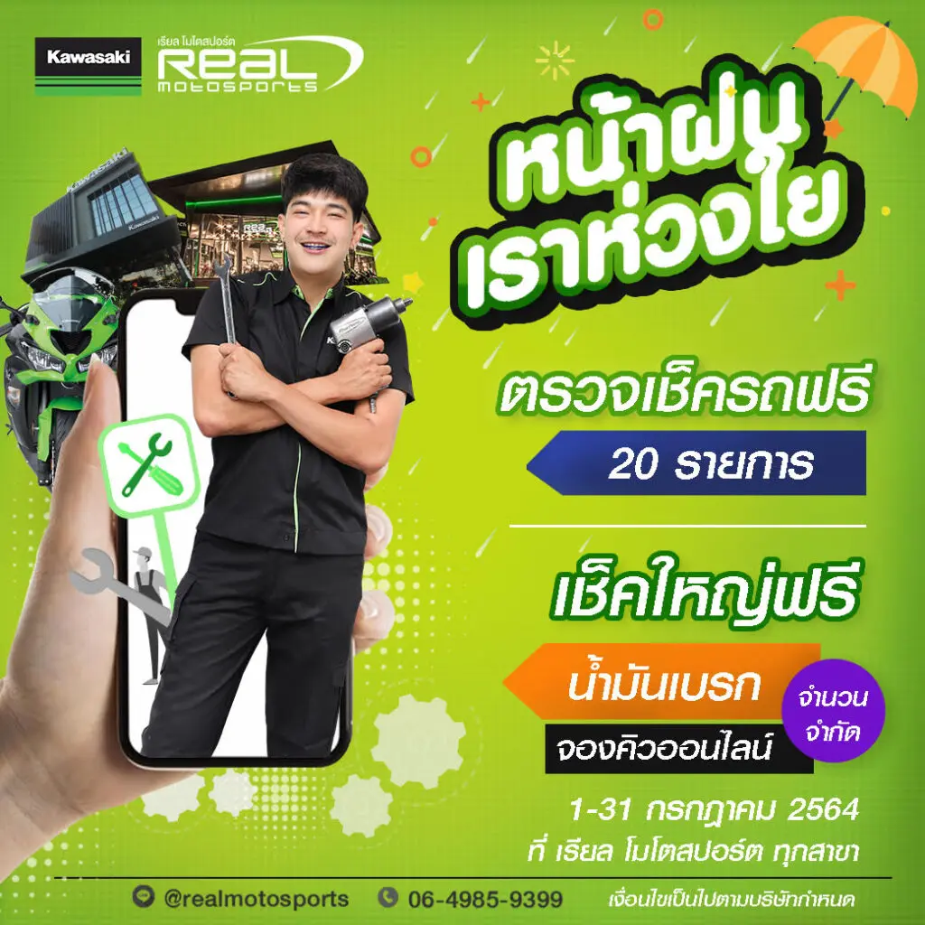 หน้าฝนเราห่วงใย ตรวจเช็คฟรี 20 รายการ เมื่อเข้ามาใช้บริการที่ ศูนย์ เรียล โมโตสปอร์ต จองคิวออนไลน์เข้ามา ฟรี! น้ำมันเบรก สำหรับลูกค้าที่เข้าเช็คระยะ (เช็ครอบใหญ่) 12,000 km. / 24,000 km. / 36,000 km. / 48,000 km. / 60,000 km. รีบจองหน่อย จำนวนจำกัดนะ เริ่ม 1-31 กรกฎาคม 2564 ติดต่อสอบถามเพิ่มเติมหรือจองได้แล้วที่ ลูกค้าสัมพันธ์ เรียล โมโตสปอร์ต โทร. 064-985-9399 Line : @realmotosports https://goo.gl/nTvfKJ Inbox : m.me/realmotosports